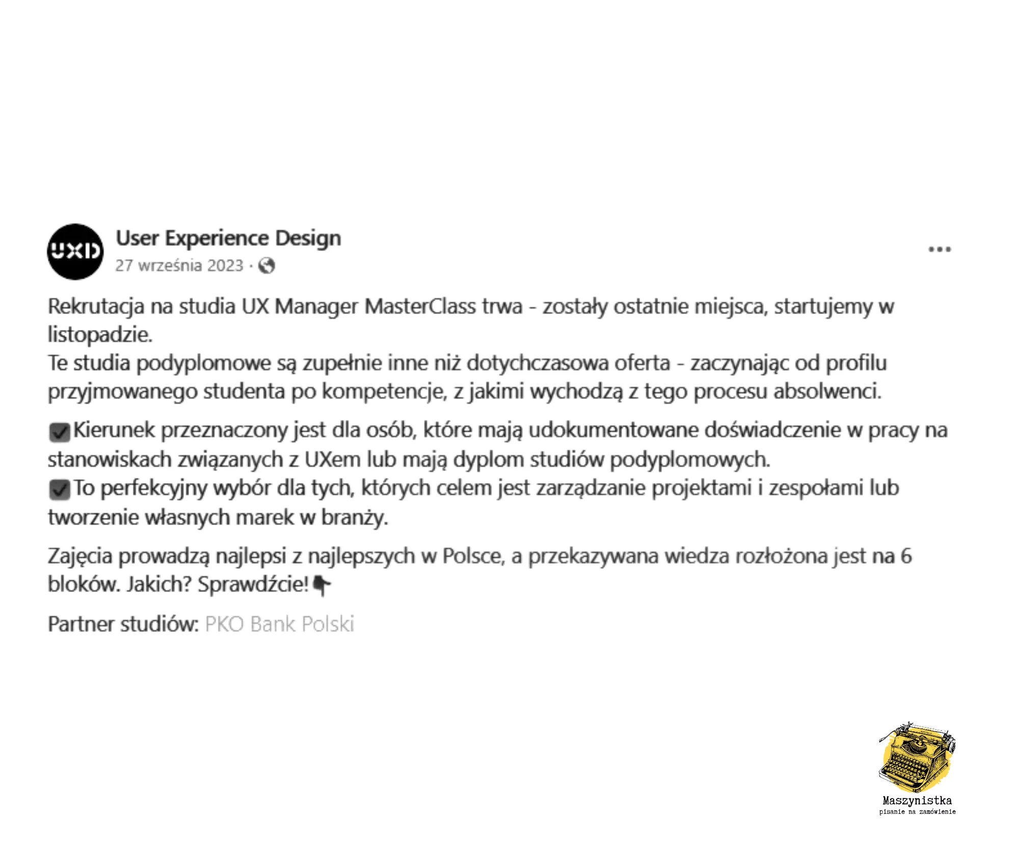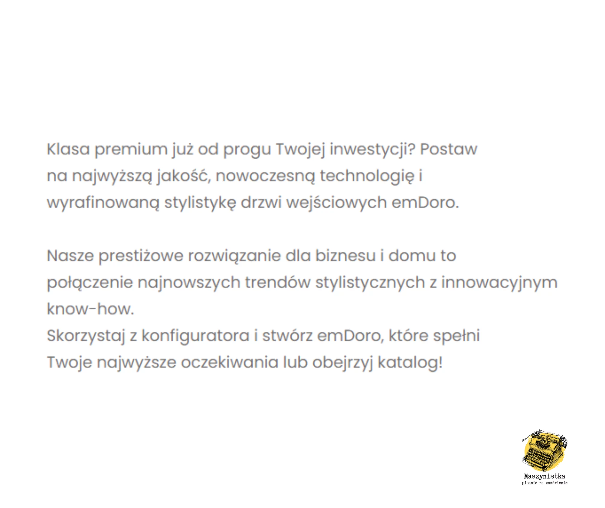 Chociaż do codziennej pracy używam zupełnie innej maszyny, z pewnością piszę szybko, dużo i kreatywnie. Mogę pochwalić się tysiącami napisanych i setkami zredagowanych tekstów dla dziesiątek klientów z wielu różnorodnych branż. Na co dzień współpracuję z małymi i średnimi przedsiębiorstwami, wspierając je w kwestiach komunikacji i wizerunku oraz jako specjalistka PR i copywriter z agencjami reklamowymi. Skontaktuj się ze mną – z przyjemnością Ci pomogę!